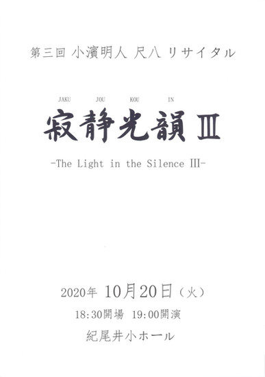 【タイトル】 第三回 小濱明人 尺八 リサイタル「 寂静光韻 Ⅲ」 【開催日】 2020年10月20日(火) 【場 所】 東京都 千代田区 紀尾井小ホール 【演奏曲目】 1、瀧落