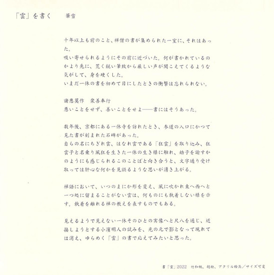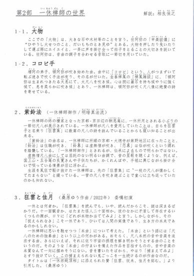 1部では、鎌倉時代からの伝承とされ、尺八本曲の中でも最も大切にされてきた「古伝三曲(三虚霊)」を古い流派・形態順に演奏します。また2部では、中世の尺八《一節切》を吹いた一休禅師に焦点をあて、一節切曲(復曲)、一休禅師作とされる「紫鈴法」、そして終曲には桑原ゆう氏に委嘱した、一休をテーマにした新曲を吹奏します。また、書と空間演出を華雪氏が担当。「尺八の中世」を多面的に表現いたします。